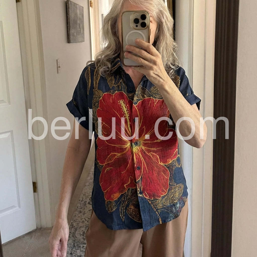 Channel island vibes with this Bold Tropical Hibiscus Print Top, a vibrant statement piece that brings the essence of paradise to your wardrobe. Crafted from lightweight, breathable fabric—likely cotton or linen blend—it features a rich navy base adorned with a striking oversized red hibiscus flower outlined in golden yellow, complemented by intricate leafy patterns throughout. The classic short-sleeve shirt design includes a relaxed fit, button-down front, and rolled sleeves for an effortless, laid-back look. Perfect for pairing with denim jeans, high-waisted shorts, or flowy skirts, this top is ideal for beach days, tropical getaways, or summer city strolls. Its bold floral motif exudes bohemian charm and exotic flair, making it a standout choice for those who love fashion with personality. Inspired by the playful, romantic styles found on sites like Lulus, this shirt effortlessly blends artistry and comfort—ideal for adding a splash of color and confidence to your warm-weather wardrobe.