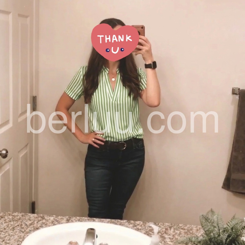 I designed this blouse to bring a fresh twist to classic striped styles. The green and white stripes are updated with a stand collar and notched V-neck, adding a modern, polished touch.The relaxed fit skims over the torso, and the short, cuffed sleeves are perfect for warm weather. The lightweight fabric is soft and breathable, making it comfortable for all-day wear.