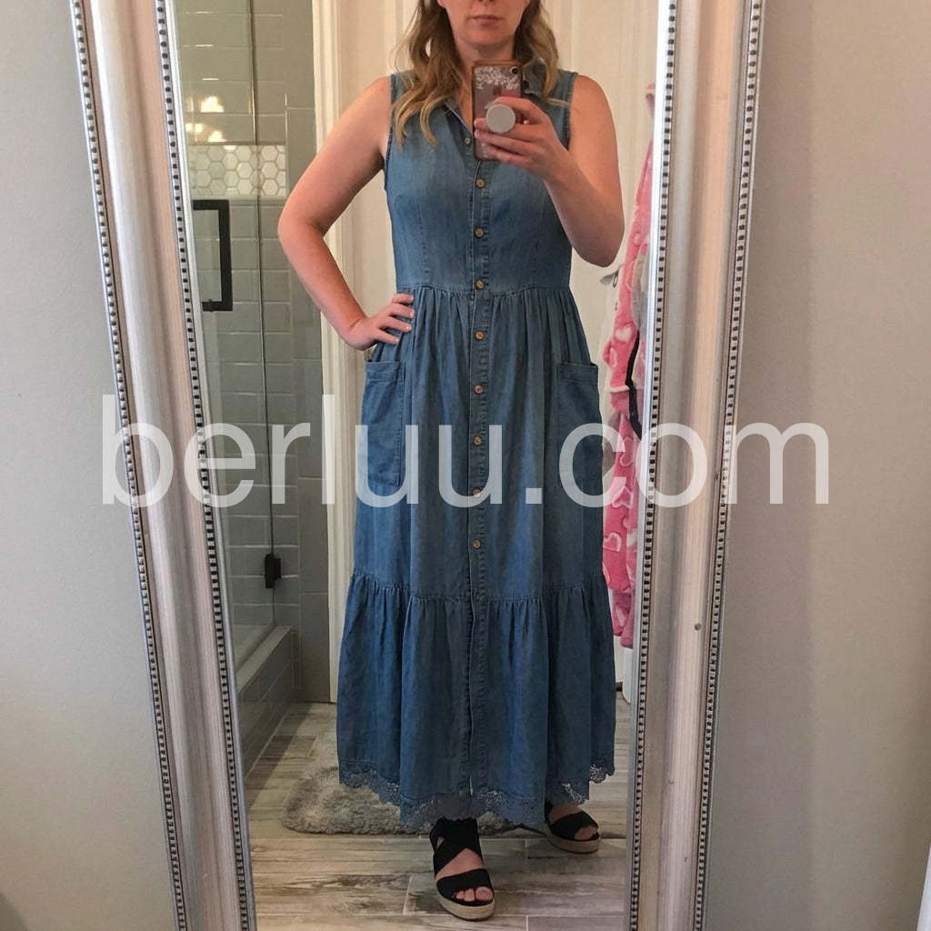 Blue Sleeveless V-Neck Button Front Denim Maxi Dress