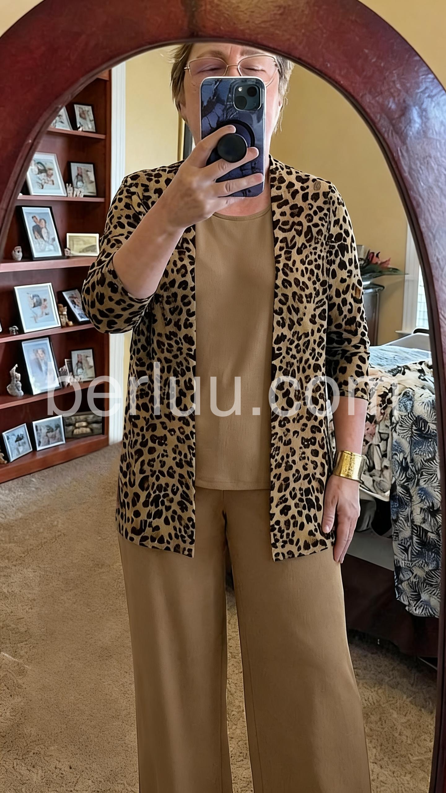This coordinated set includes a leopard-print top, matching wide-leg pants, and a lightweight duster cardigan in warm brown tones. The relaxed fit offers comfort with a stylish edge. Perfect for casual outings or elevated loungewear. Effortlessly trendy with a wild, boho flair. Ideal for spring and summer layering.