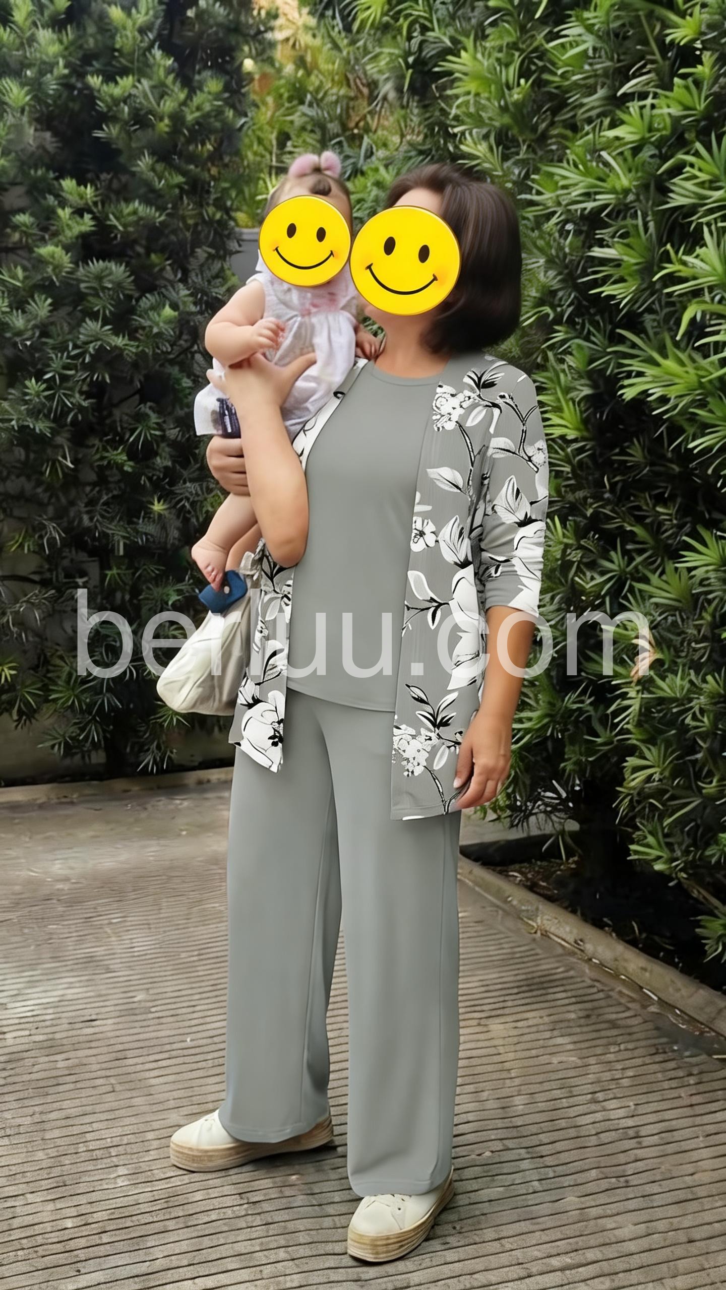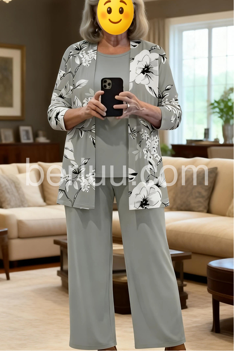 This coordinated set features a floral-print blazer with solid gray pants and a matching top. The relaxed fit offers comfort and style. Lightweight fabric perfect for casual or office wear. Ideal for creating a polished, put-together look. Sophisticated and effortlessly chic.