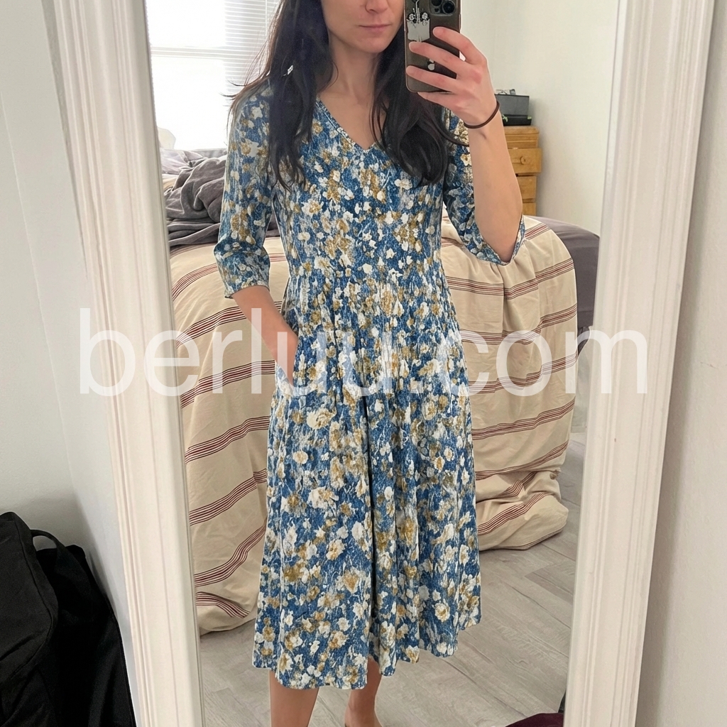 The V-neck and elbow-length sleeves offer flattering coverage, while the flowy A-line skirt skims over curves. The hidden side pockets add practicality, and the lightweight fabric keeps you cool and comfortable.
