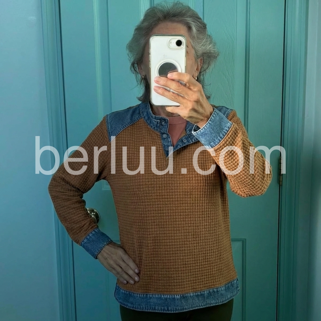 Crafted from premium denim, this long sleeve top features a sophisticated brown color block design that adds visual interest and versatility to your wardrobe. The structured fabric provides durability and maintains its shape through regular wear, while the extended sleeves offer practical coverage. The color blocking technique creates a modern silhouette that works seamlessly with both casual and elevated styling. Perfect for layering or wearing as a standalone piece, this top delivers timeless appeal with contemporary flair.