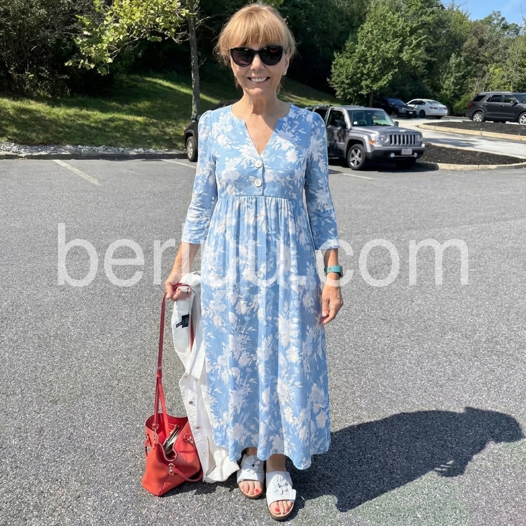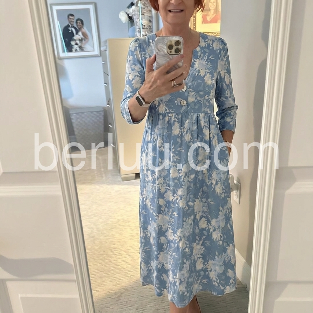 This dress is a study in soft, timeless femininity. The muted blue base, printed with delicate watercolor-style white florals, evokes a gentle, romantic sensibility.