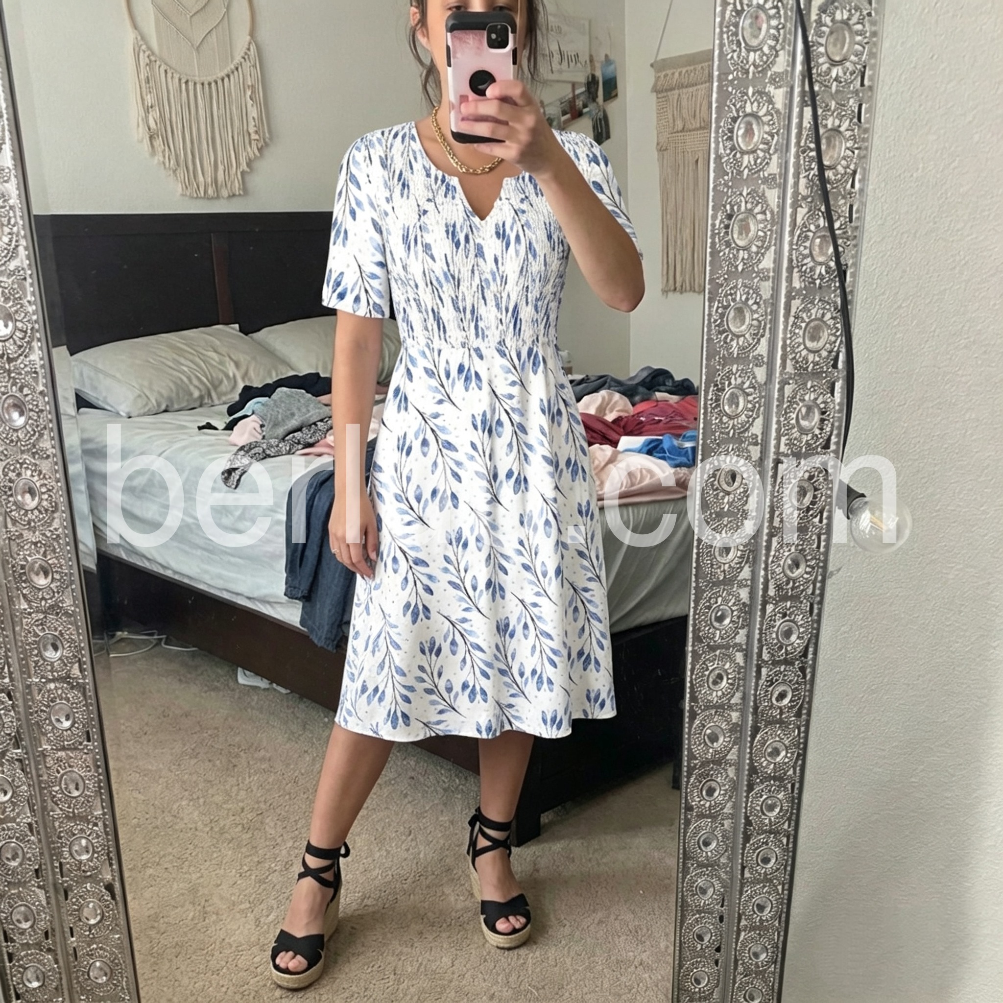 This dress balances elegance and ease with its fresh leaf print. The soft blue and white botanical pattern feels summery and calming, while the smocked waist creates a flattering silhouette. The gathered detail cinches the waist without feeling tight.