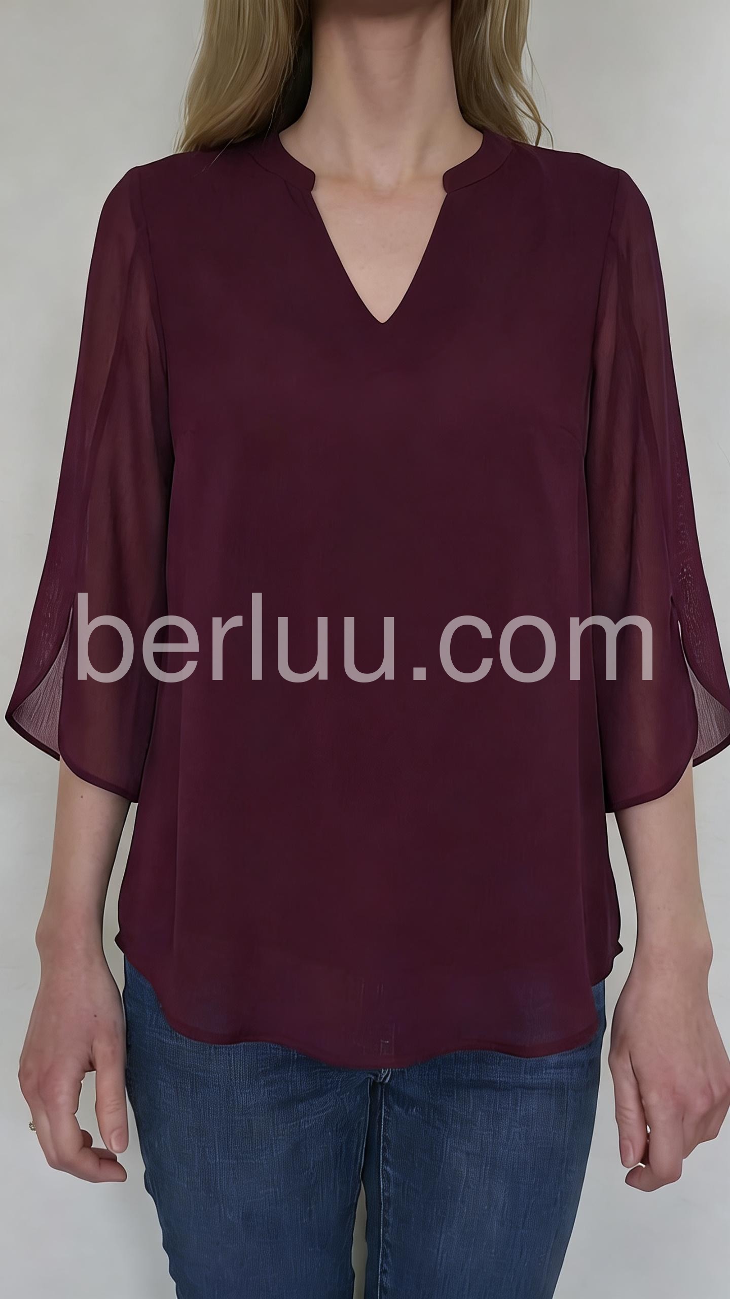Burgundy 3/4 Sleeve Plain Chiffon Top