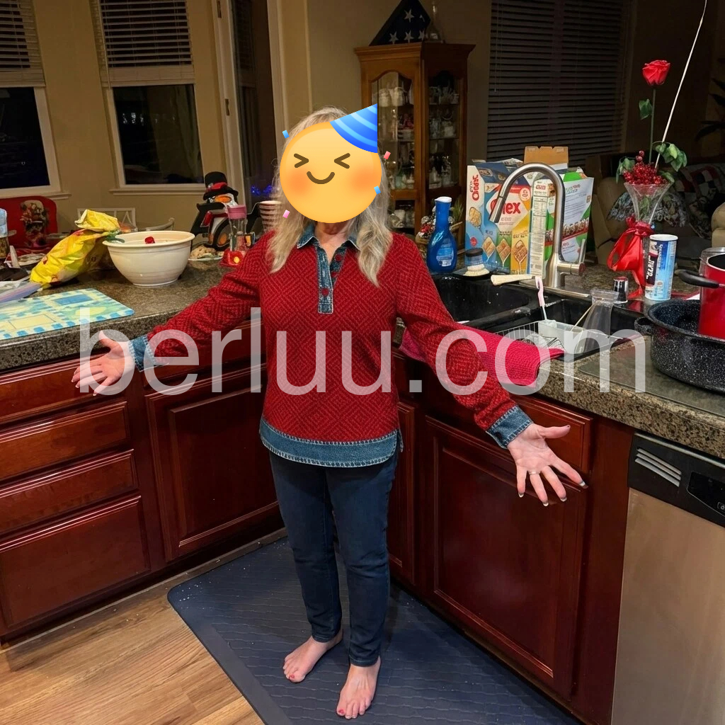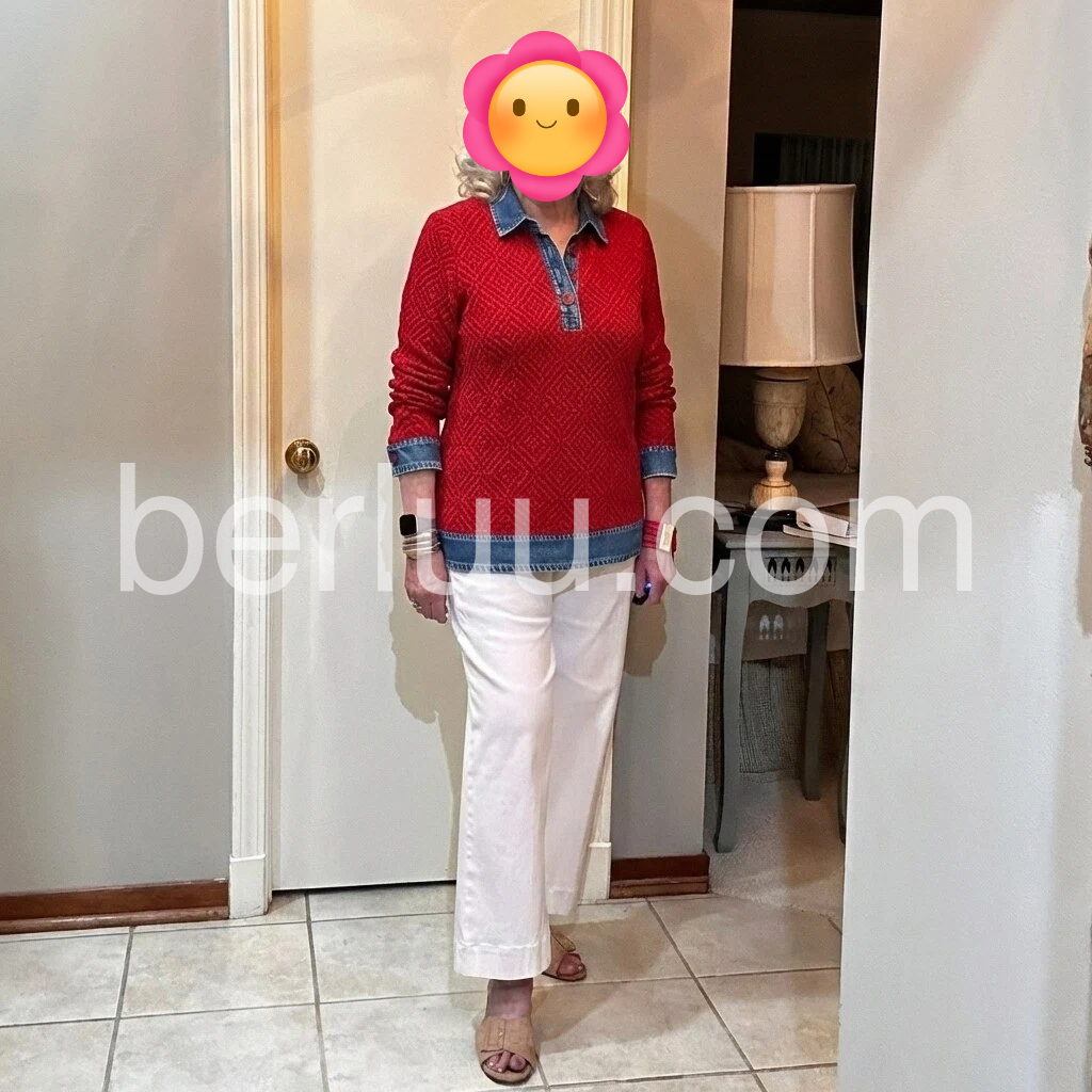 I can’t stop wearing this top! The textured red knit is cozy and durable, and the denim collar and hem add a fun, rugged charm. The red buttons are a nice touch, and the fit is true to size. It washes well too—no fading or shrinking after multiple wears. Definitely worth every penny!