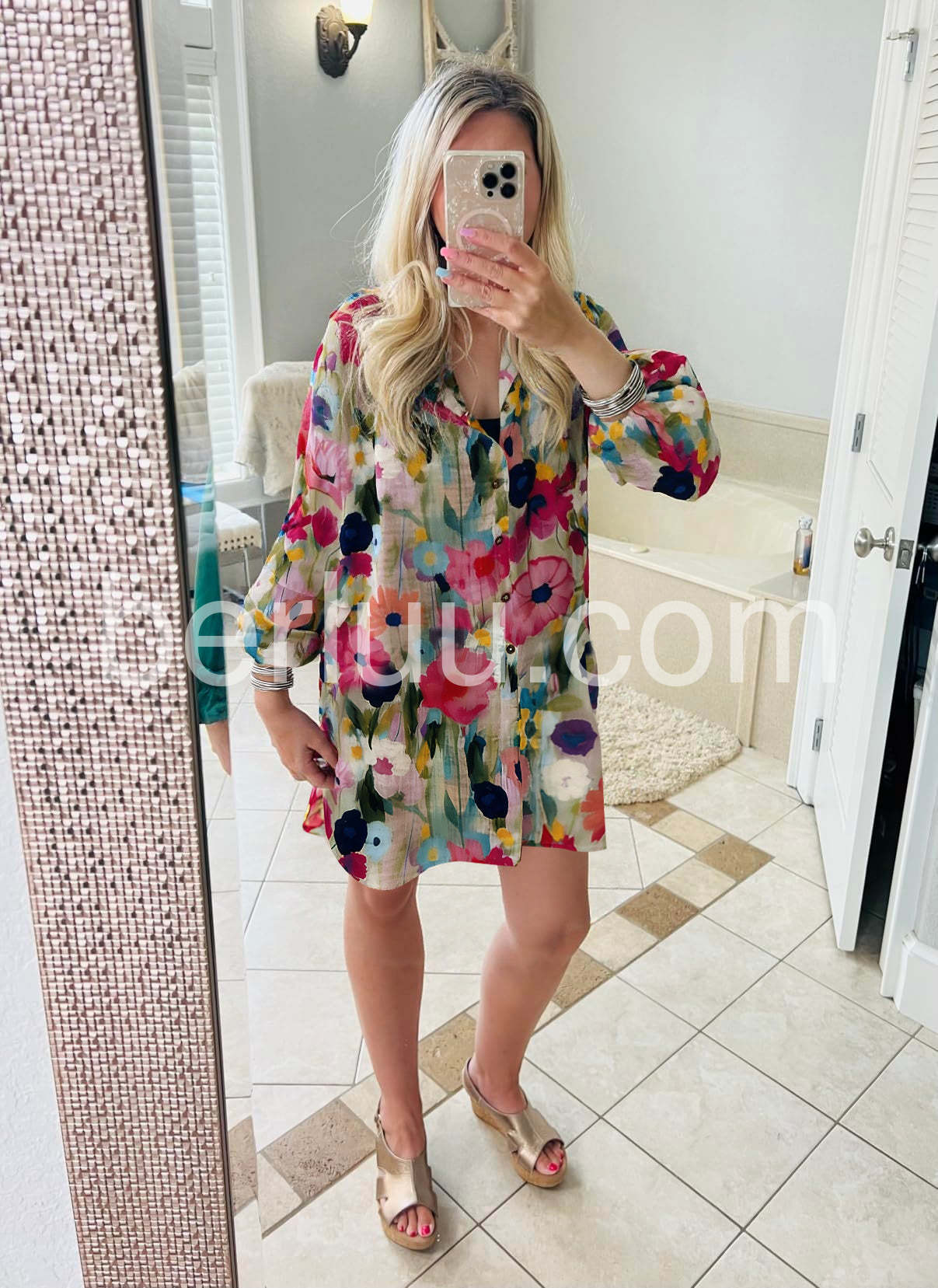 Embrace effortless style with this Bold Floral Print Shirt Mini Dress, a vibrant and versatile piece that turns heads with its lively, painterly design. Crafted from lightweight, breathable fabric—likely cotton or linen blend—this oversized dress features a dynamic watercolor-inspired floral pattern in rich shades of fuchsia, navy blue, coral, white, and soft green, creating a joyful burst of color against a neutral base. The classic shirt silhouette includes a collared neckline, front button closure, and long sleeves that can be rolled up for a relaxed, laid-back look. Its loose, flowing fit drapes beautifully, offering comfort and movement while exuding boho-chic charm. Perfect for casual outings, beach days, or weekend strolls, it pairs effortlessly with sandals, sunglasses, and a crossbody bag. Styled here with layered bracelets and minimalist jewelry, it balances bold print with understated elegance. Let this floral shirt dress become your go-to choice for summer fashion that’s both expressive and easygoing.
