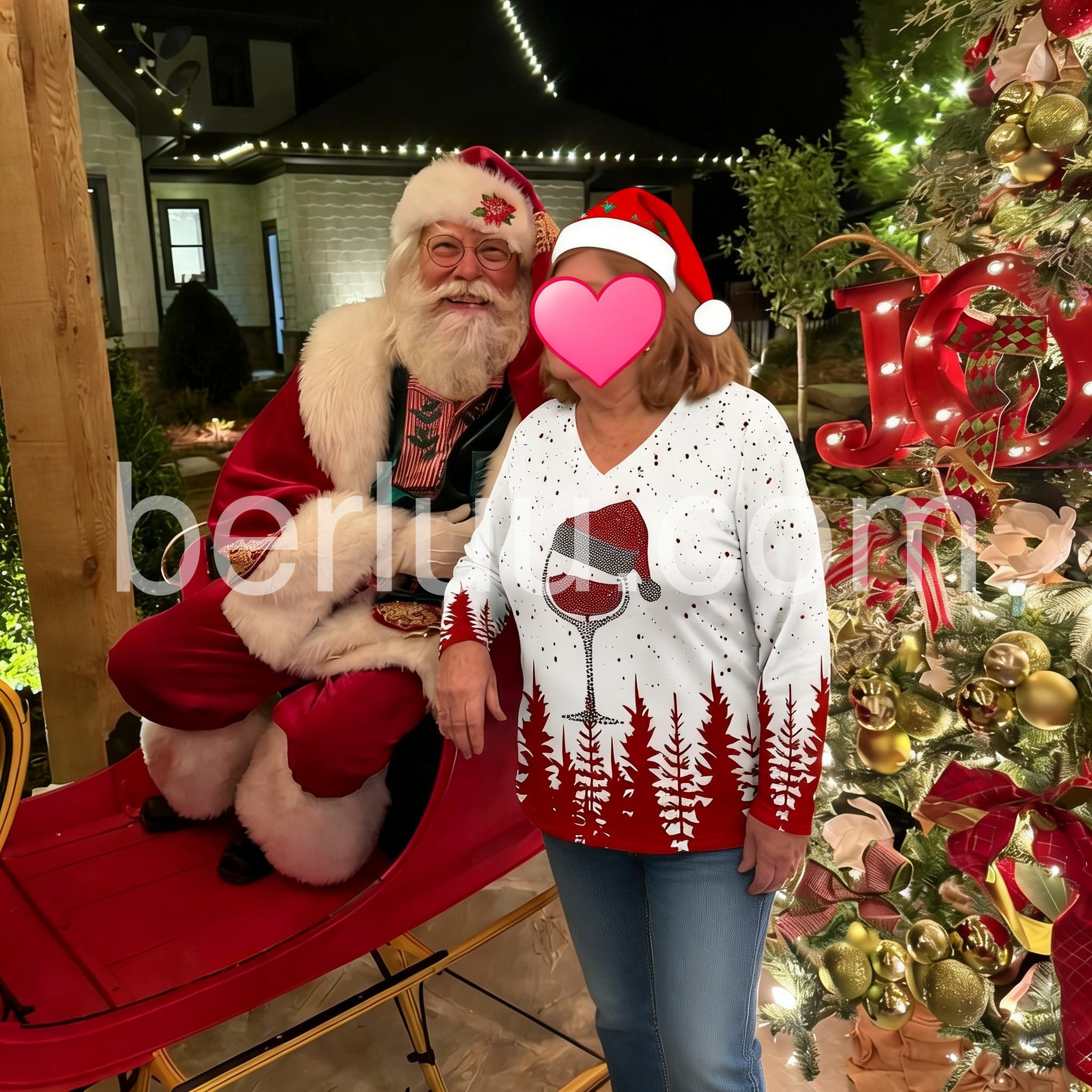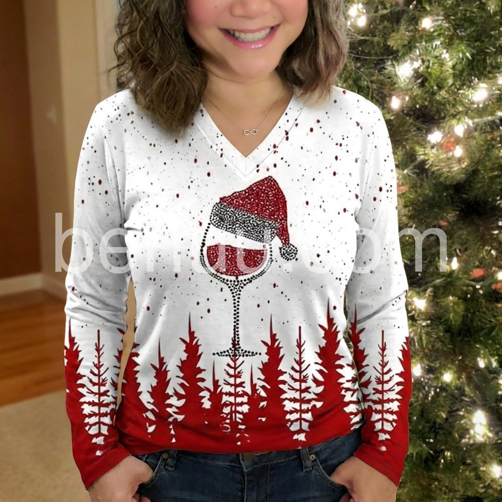 Spread holiday cheer with this long sleeve v-neck top! A dotted mosaic creates a tipsy red wine glass Santa Claus hat print, setting a fun and flirty mood for your next Christmas party. Red pine trees add the perfect backdrop for any time you need a joyful reminder of your favorite time of year.