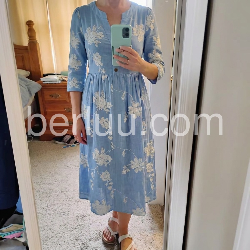 Crafted to solve the "plain linen dress" pain point, this dress is adorned with intricate floral embroidery that adds artistry to everyday wear. The V-neck flatters the bust, while the pleated waist cinches without squeezing.