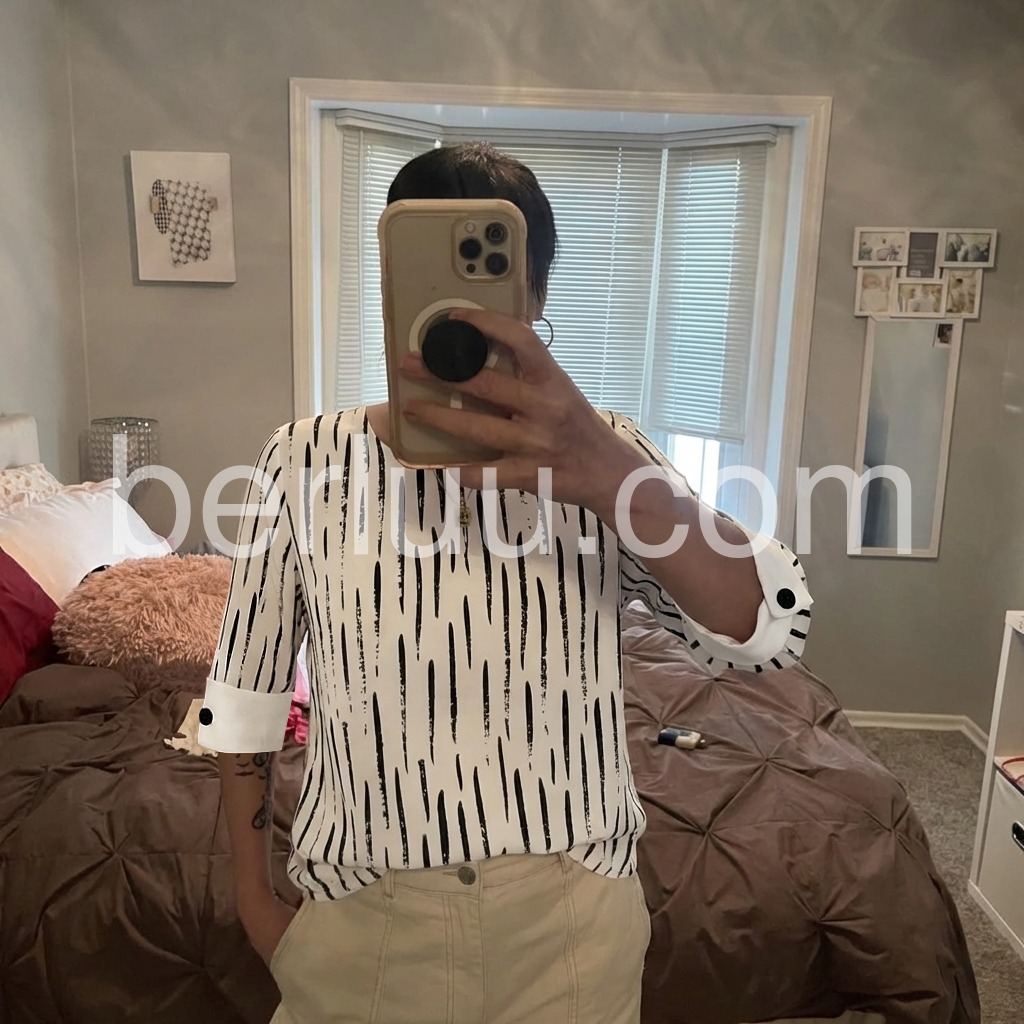 Elevate your everyday wardrobe with understated sophistication. This loose-fit top showcases a striking black brushstroke pattern against crisp white, creating an artistic statement that whispers rather than shouts. The round neckline offers clean minimalism, while three-quarter sleeves with buttoned cuffs introduce a polished, intentional detail. Crafted from a breathable cotton-elastane blend, it moves with you effortlessly—whether you're navigating the office, meeting friends for brunch, or enjoying a weekend escape. The relaxed silhouette flatters all body types while maintaining an air of refined ease. Machine washable for hassle-free care. This is the piece that transforms a basic outfit into something memorable.