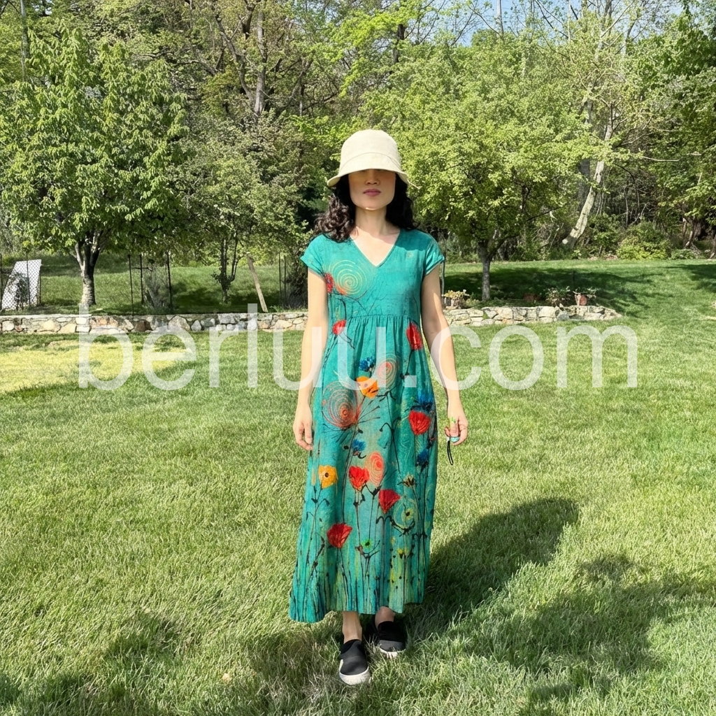 Channel bohemian vibes with this stunning teal maxi dress. It showcases vibrant, artistic floral prints with swirling details, making it a true work of art.