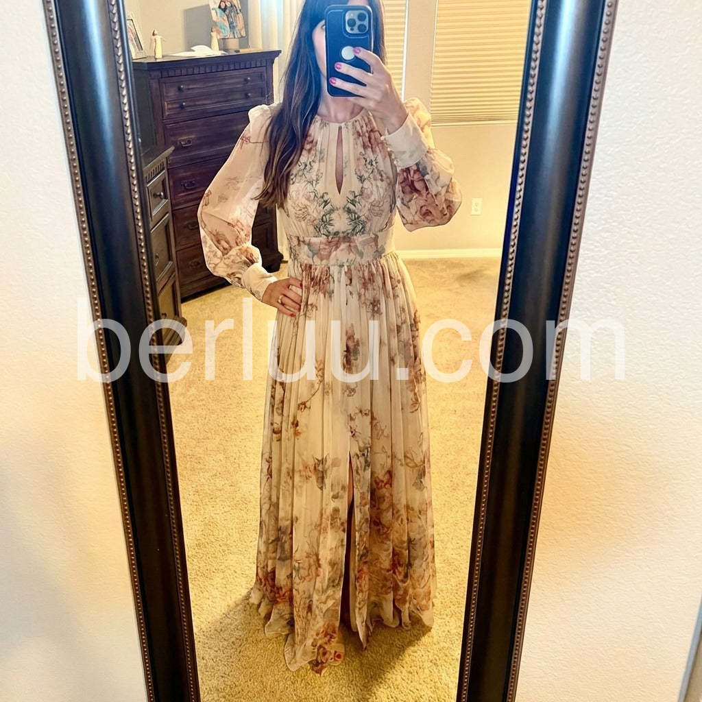 Vintage Floral Chiffon Long Sleeves Maxi Dress
