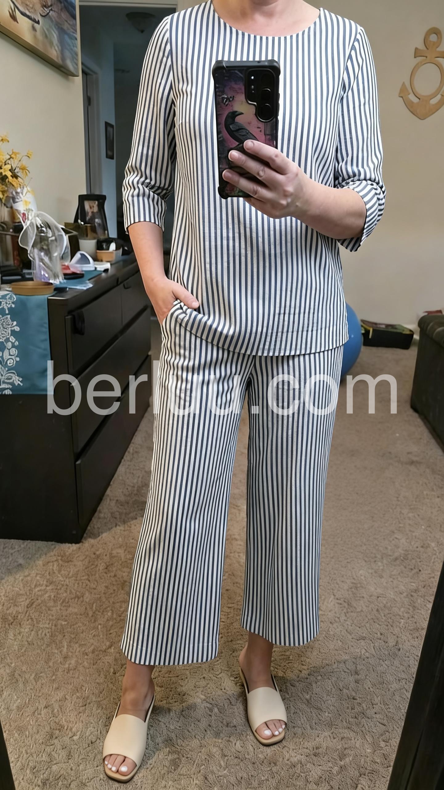 This coordinated set features a relaxed-fit top and wide-leg cropped pants in classic blue and white stripes. The three-quarter sleeves and round neckline offer a clean, timeless look. Lightweight fabric perfect for warm weather. Ideal for casual outings or smart-casual events. Effortlessly chic and easy to style.