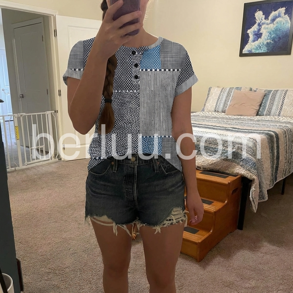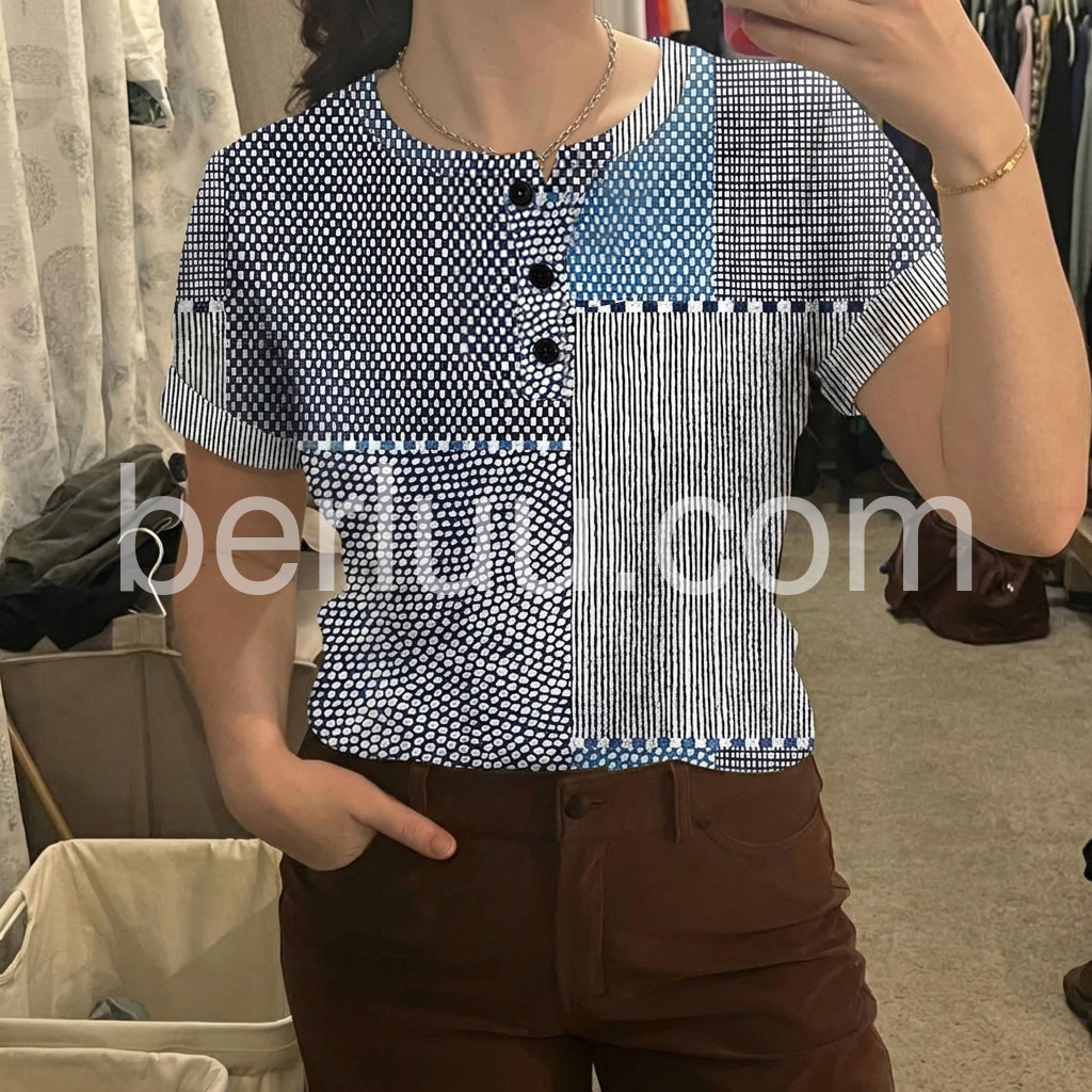 This geometric print blouse is so cool and modern! The blue and white patchwork is eye-catching, and the fit is flattering on every body.