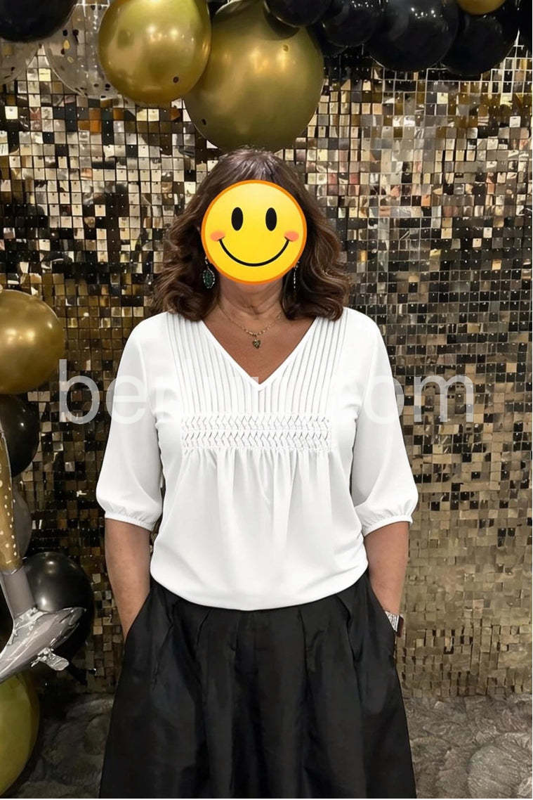 Elevate your everyday wardrobe with this timeless white V-neck top. Crafted from quality fabric, it offers a flattering silhouette that transitions seamlessly from casual to professional settings. The classic V-neckline provides a refined touch, while the plain design ensures versatile styling with virtually any piece in your closet. Perfect for layering or wearing solo, this essential staple delivers understated elegance and reliable comfort for year-round wear.