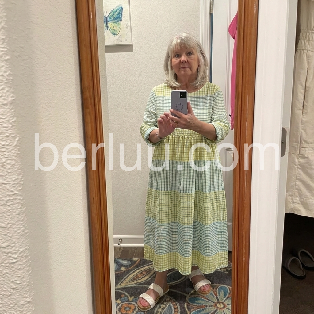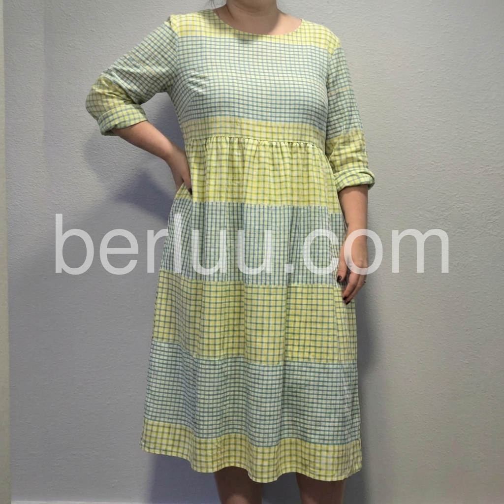 This midi dress celebrates effortless summer style with a playful color-block gingham design. The round neck, 3/4 sleeves, and tiered skirt offer a relaxed, flowy fit.