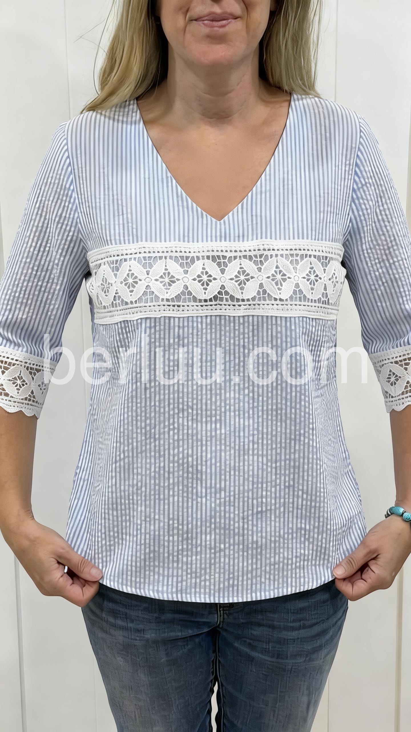 This relaxed-fit top features soft blue and white stripes with delicate lace detailing across the chest and sleeves. V-neckline and three-quarter sleeves for a comfortable fit. Lightweight fabric perfect for warm days. Effortlessly stylish with a touch of bohemian charm. Ideal for casual wear or beach outings.