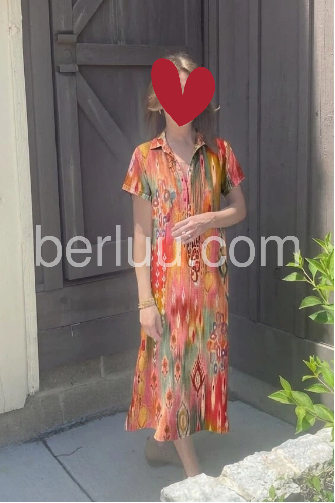 This mid-length shirt dress features a bold ikat pattern in warm reds, pinks, and earthy tones. With short sleeves, a button-down front, and relaxed fit for comfort. Perfect for summer days or casual outings. Pair with sandals for a laid-back, stylish look. Effortlessly elegant with global flair.