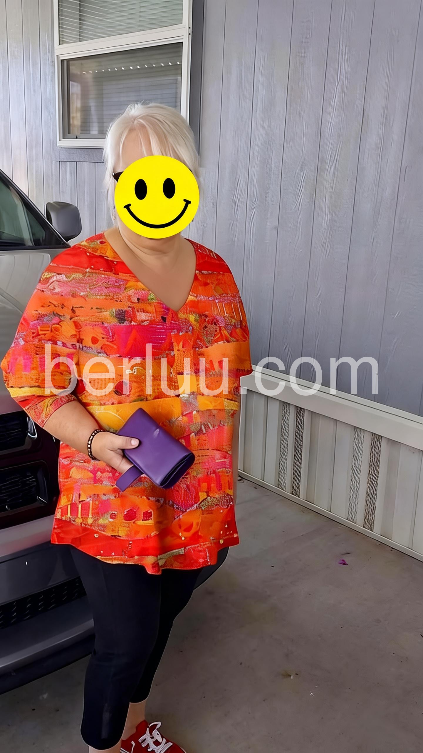 This loose-fit top features a striking abstract pattern in warm red, orange, and pink tones. V-neckline and three-quarter sleeves for comfort. Lightweight fabric with a relaxed drape. Perfect for making a statement in casual or resort wear. Effortlessly stylish and eye-catching.
