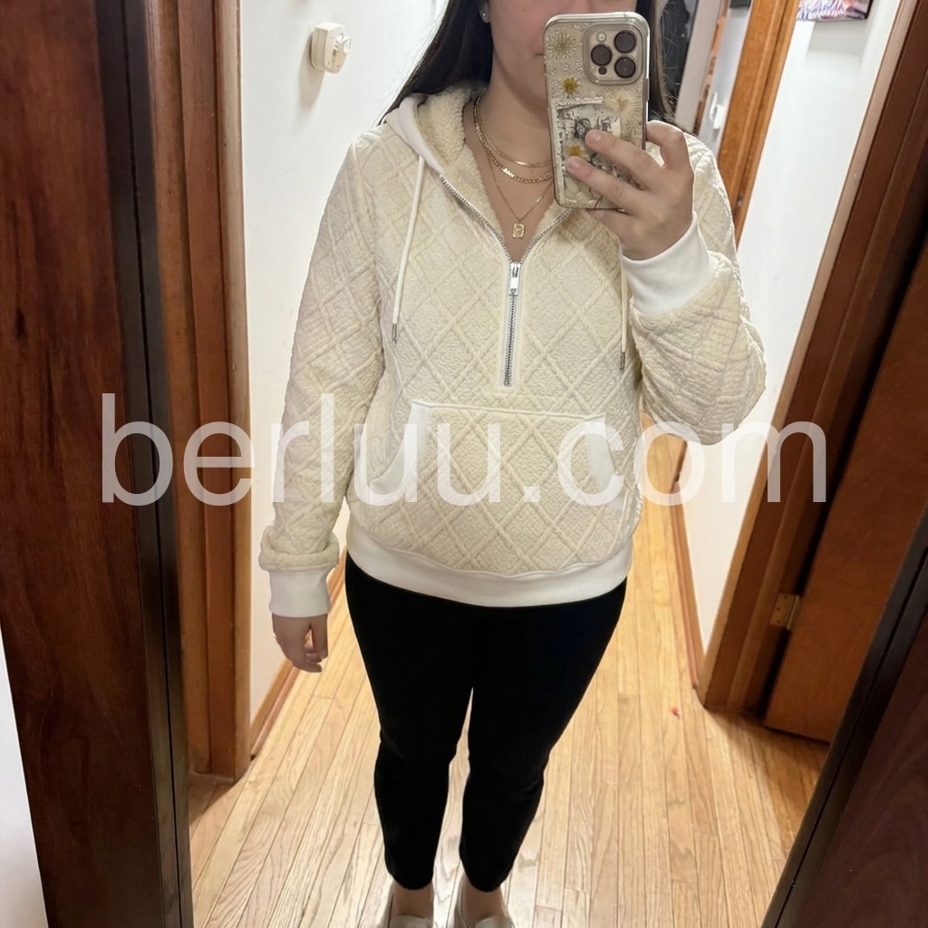 Beige Quilted Sherpa Half-Zip Hooded Sweater