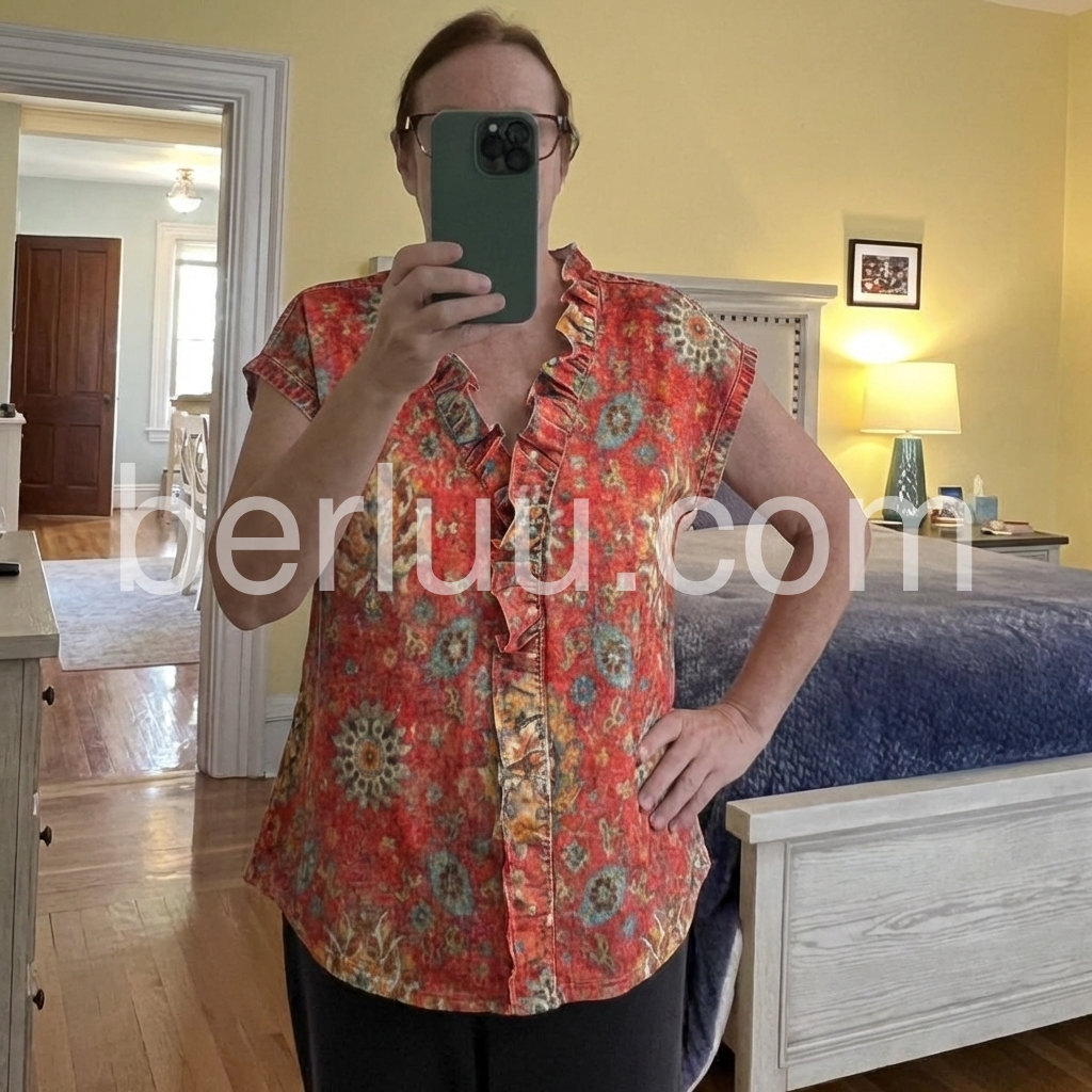 This Short Sleeve top features a rich red base with intricate mandala and floral patterns. The ruffled V-neckline adds a feminine, bohemian flair. Lightweight fabric drapes softly for a relaxed fit. Perfect for pairing with white jeans or denim shorts. Ideal for summer days with a touch of global style.