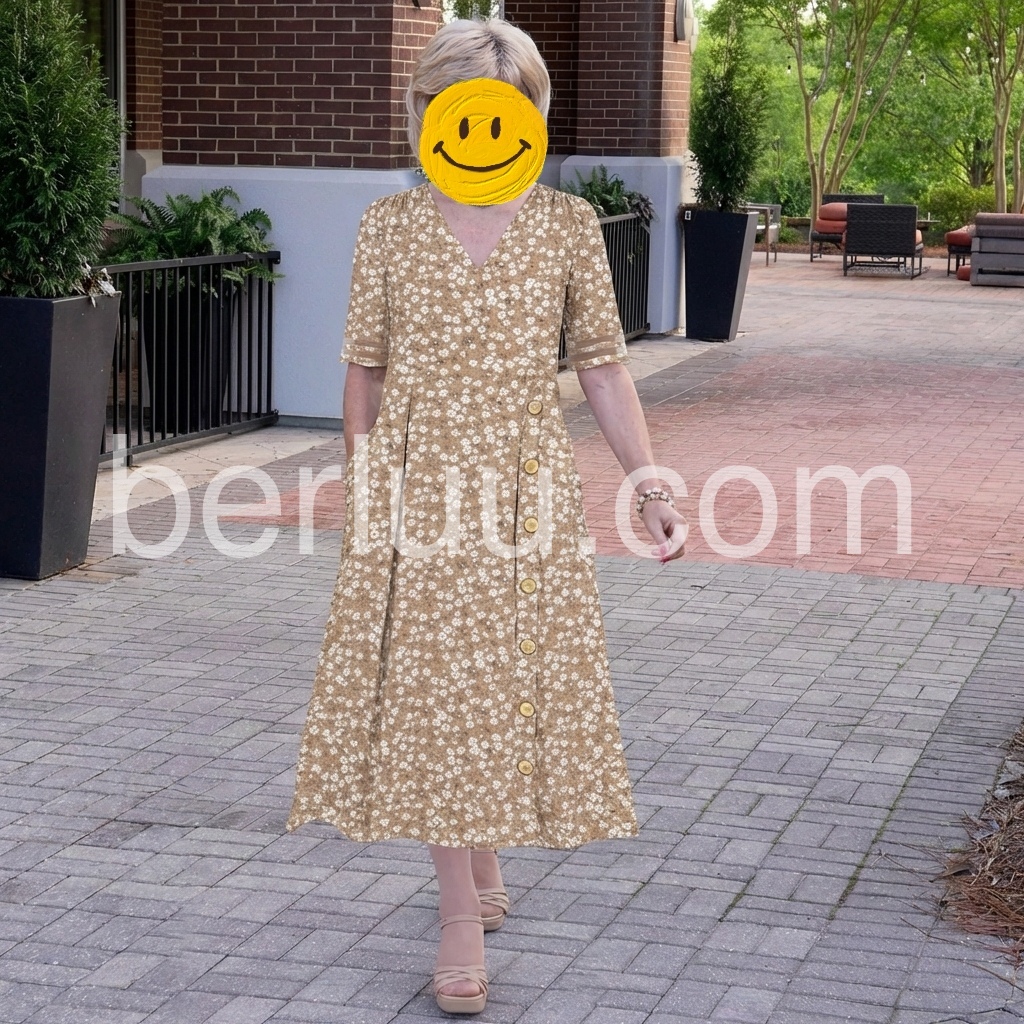 This midi dress brings soft, understated charm to your wardrobe. The warm khaki base, printed with tiny white florals, feels endlessly versatile.