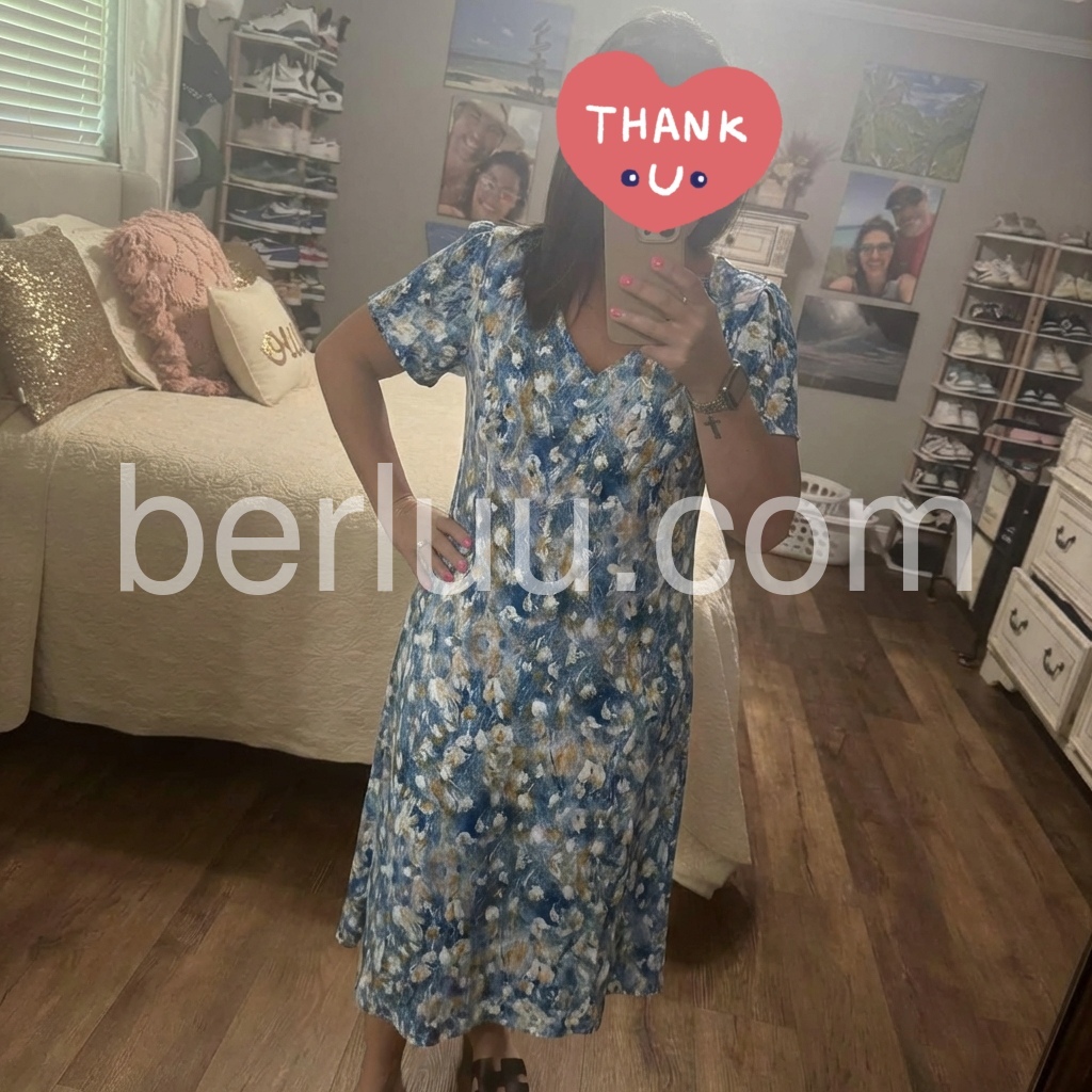 Crafted with dreamy oil-painting florals, this midi dress brings artistic elegance to your wardrobe. The V-neck, short sleeves and side slit create a flattering, flowy silhouette.