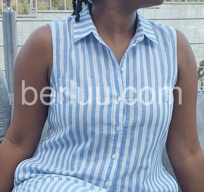 This striped sleeveless shirt dress features a classic blue and white vertical pattern with a relaxed, effortless fit. The collared neckline and front button closure add a polished touch, while the asymmetrical hem offers a modern twist. Lightweight and breathable, it’s perfect for casual summer days. Ideal for beach outings, brunches, or laid-back errands. Pair with sandals or sneakers for a fresh, coastal look.