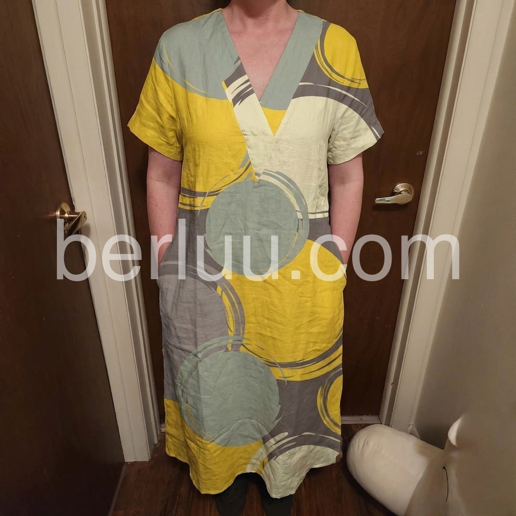 The bold yellow and gray circular print makes a striking statement, while the relaxed fit and pockets offer everyday comfort.