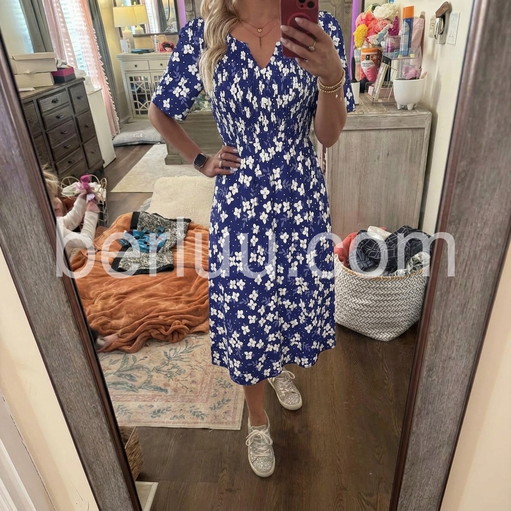 This dress solves the “cute but comfortable” dilemma with ease. The ditsy white floral print on a navy base feels fresh and summery, while the smocked waist creates a flattering silhouette. The gathered detail cinches the waist without feeling tight.