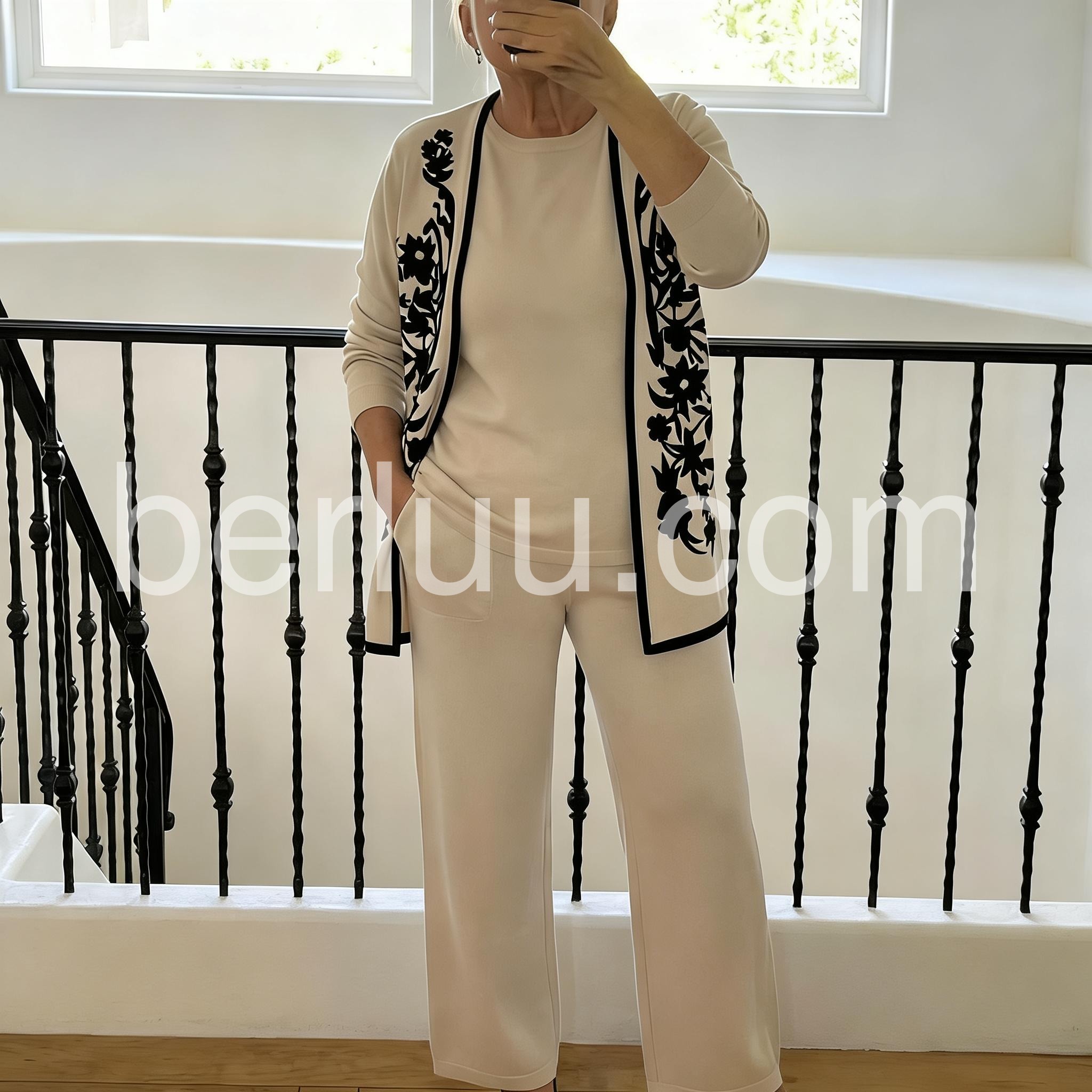 This coordinated three-piece set features a soft beige top, wide-leg pants, and an open-front cardigan with black floral embroidery. The clean lines and subtle contrast create a refined look. Perfect for casual outings or relaxed elegance. Comfortable, stylish, and effortlessly chic.