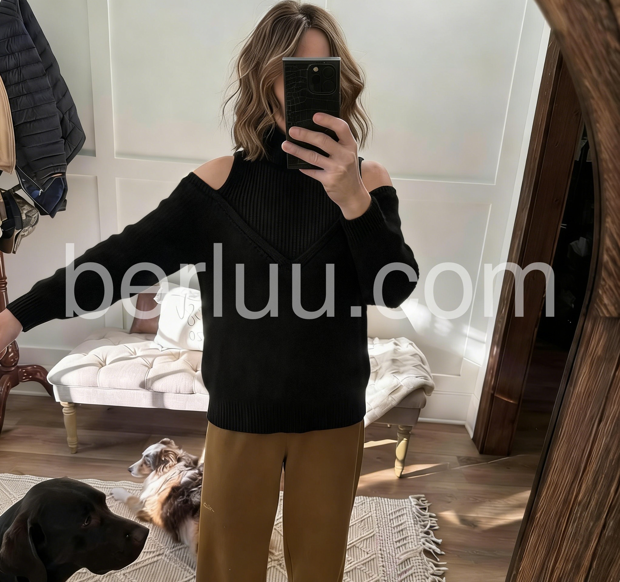 Black Plain Off The Shoulder Turtleneck Knit Sweater