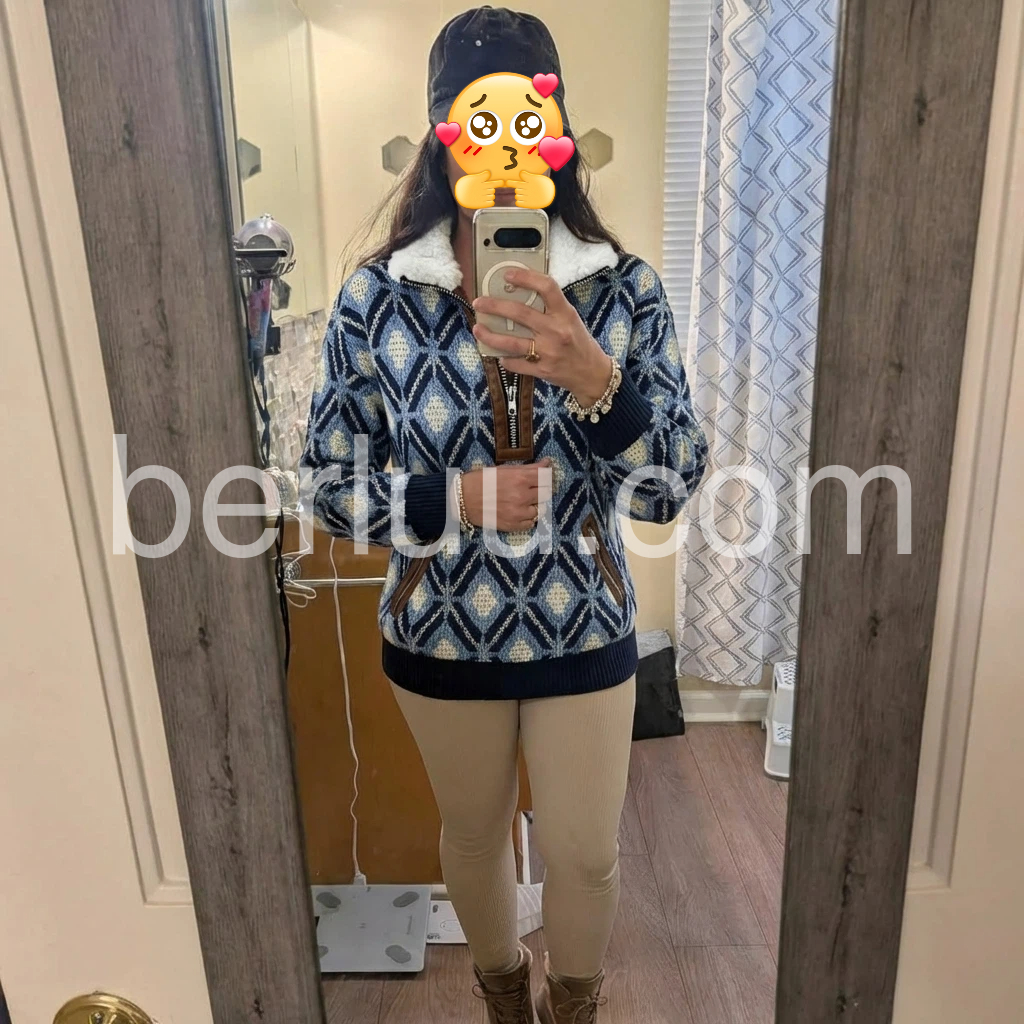 Elevate your cold-weather wardrobe with this sophisticated knit sweater, featuring a striking blue geometric pattern that adds visual interest to any ensemble. The fleece lining provides exceptional warmth and comfort, making it an ideal choice for layering or standalone wear during transitional seasons. Crafted from quality knit fabric, this piece combines contemporary design with practical functionality. The geometric detailing brings modern flair while maintaining versatility—pair it effortlessly with jeans, trousers, or skirts for polished everyday styling.