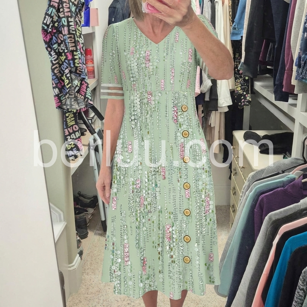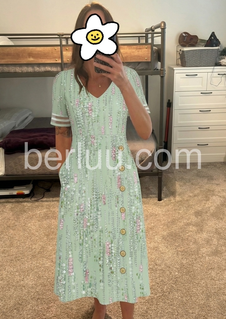 This midi dress is a celebration of feminine glamour. The V-neck, side button placket, and pockets create a flattering, practical silhouette, perfect for special events.