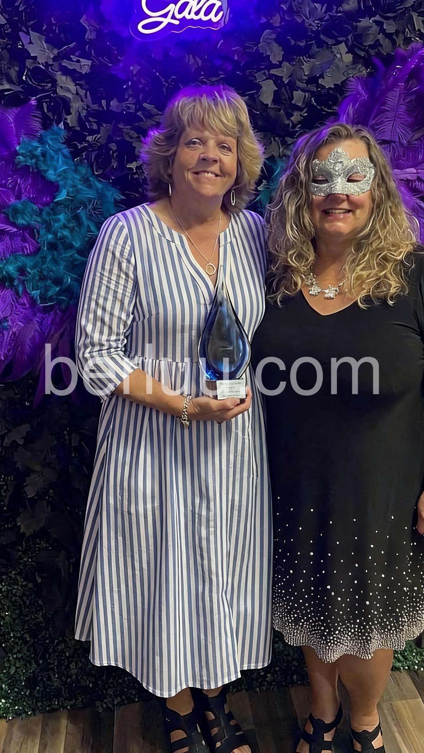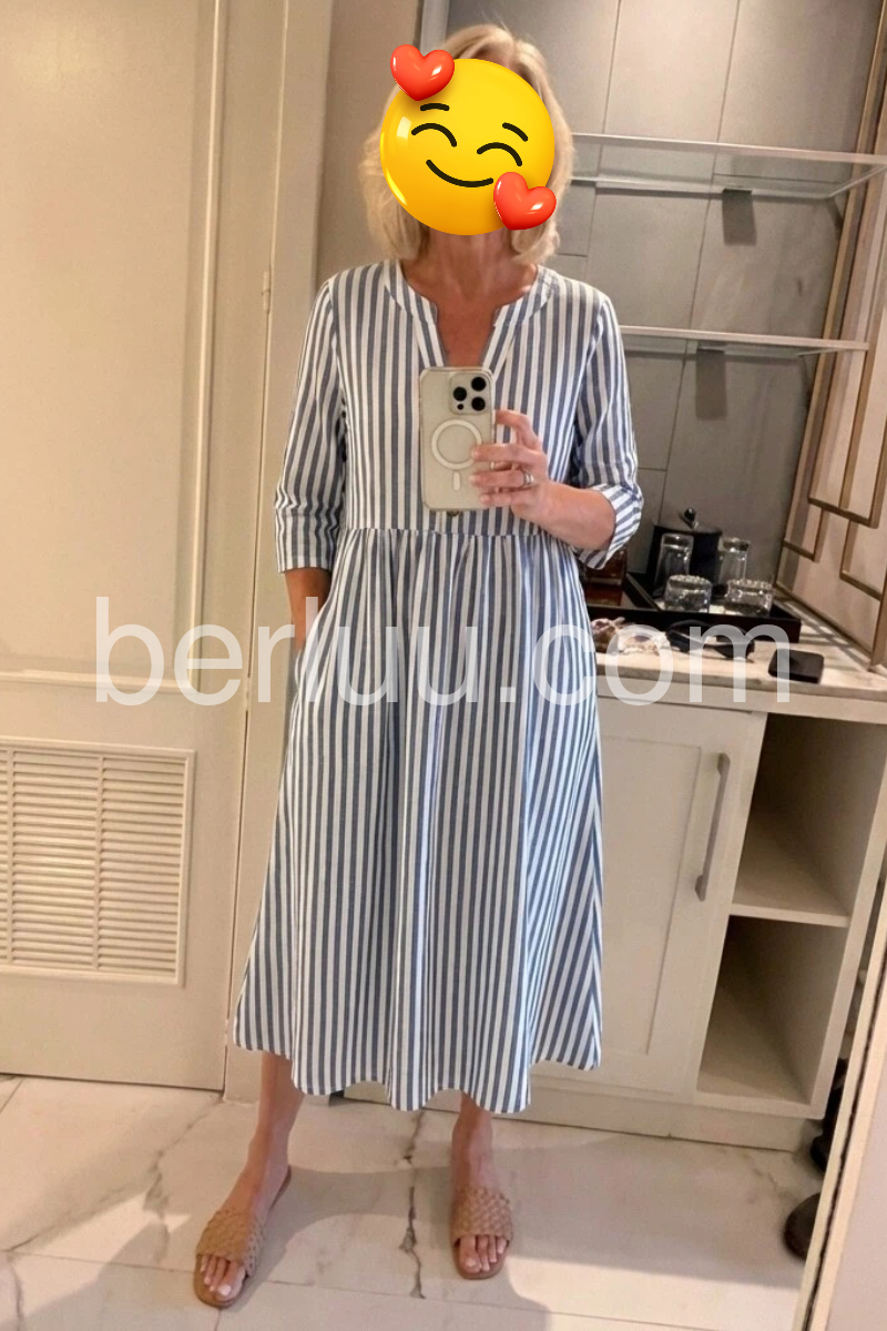 This button-front midi dress features vertical blue and white stripes. The V-neck and three-quarter sleeves offer a classic look. Side pockets add practicality and comfort. Lightweight fabric perfect for summer days. Ideal for beach outings or casual wear.