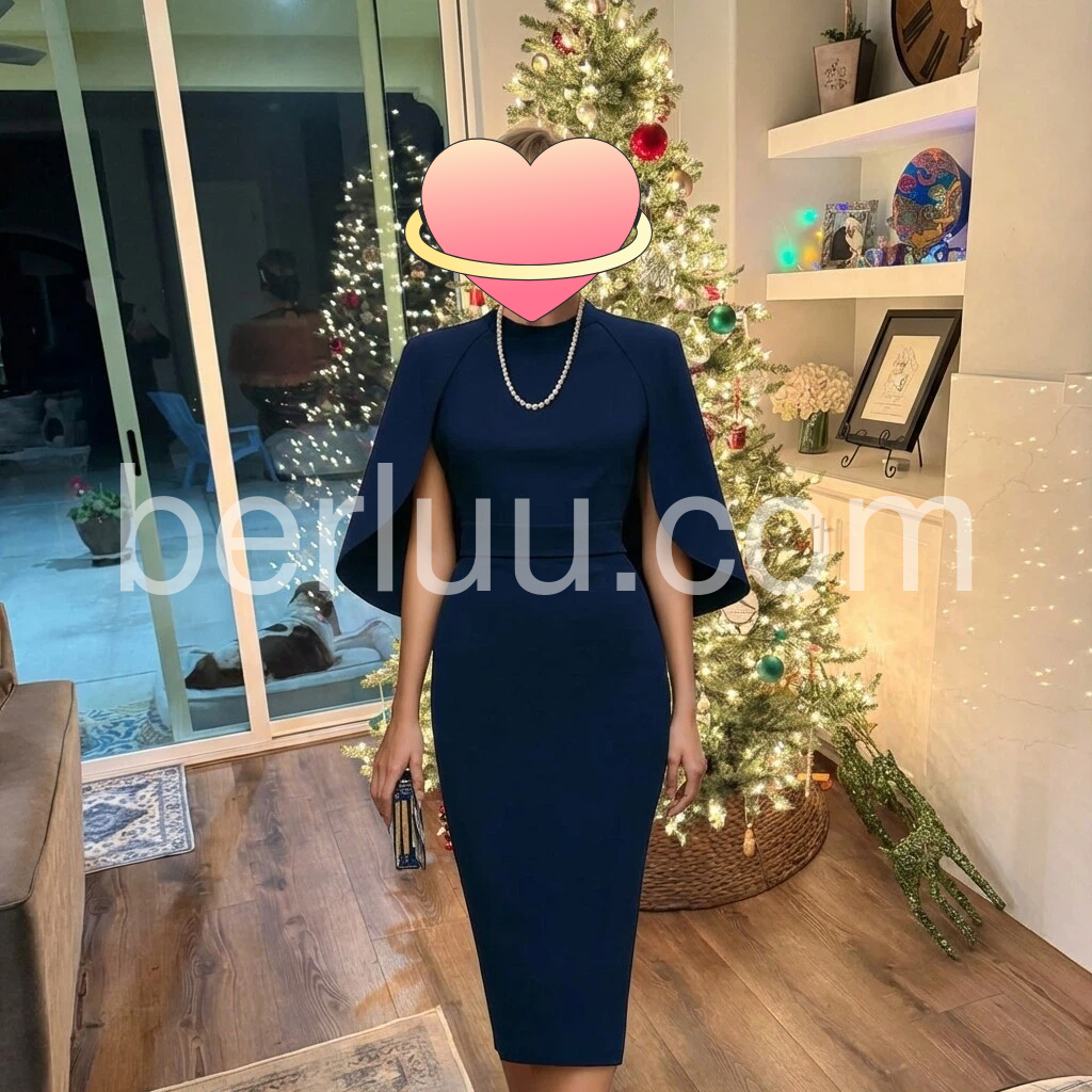 Navy Cape Sleeve Mock Neck Shirred Waist Pencil Midi Dress