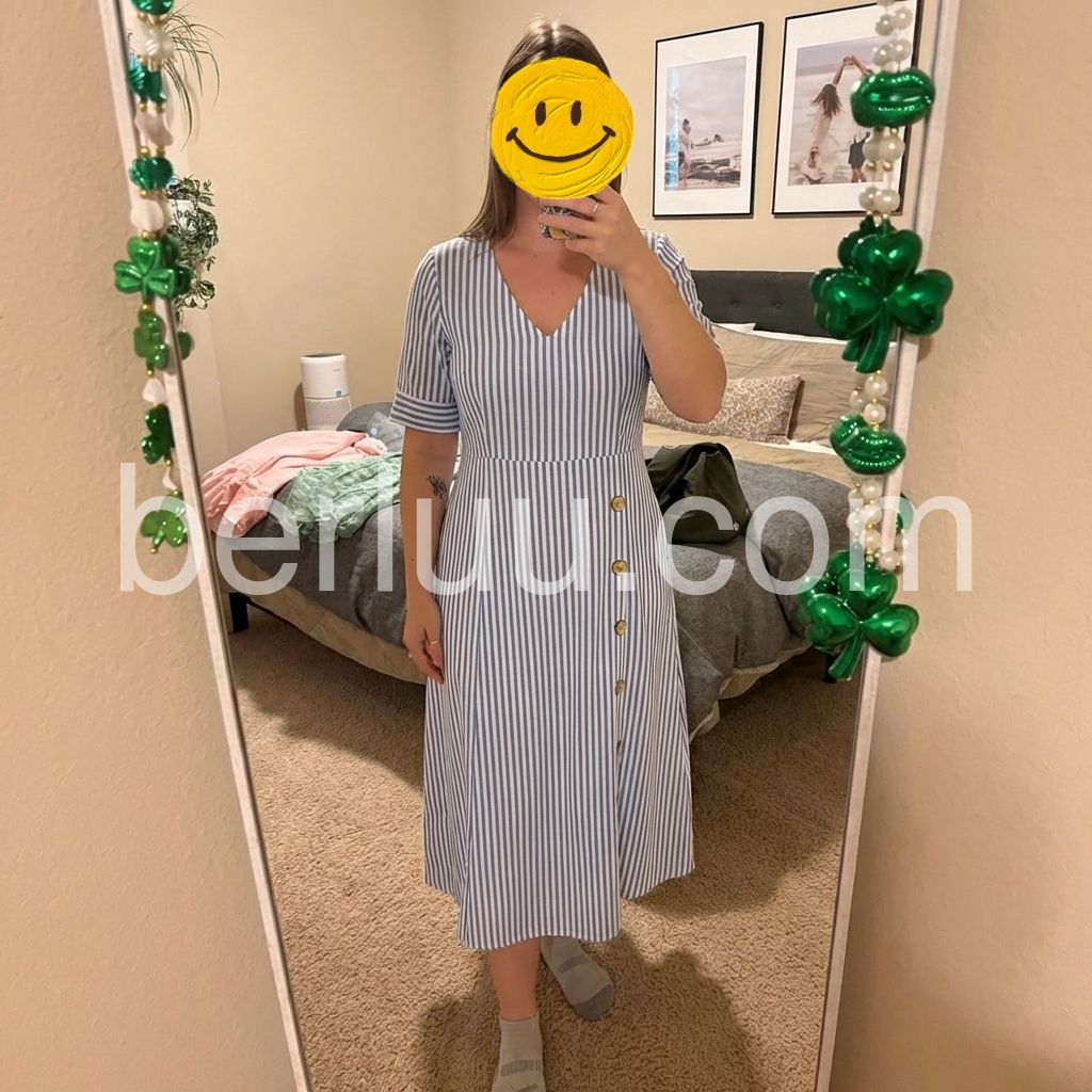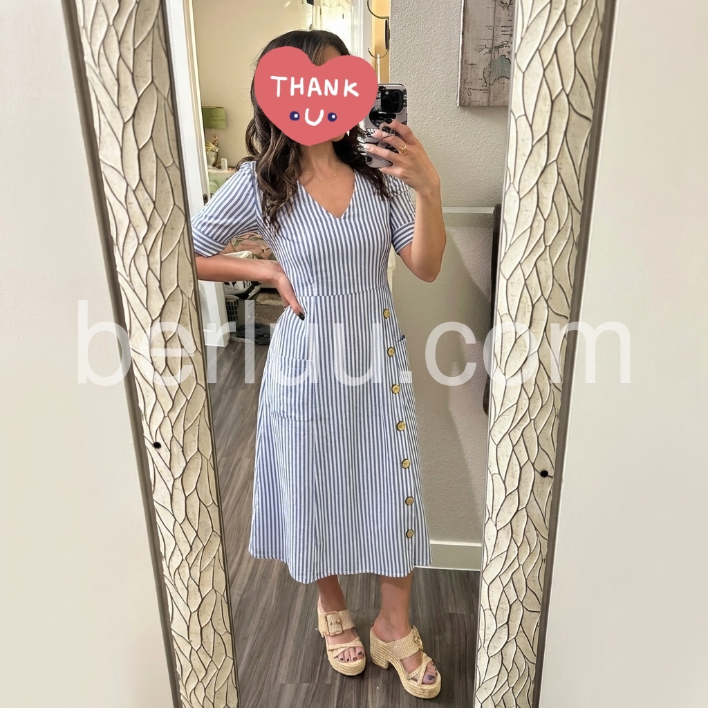 This midi dress reimagines classic nautical stripes with modern, feminine style. The crisp blue-and-white print and V-neck create a timeless, fresh look.