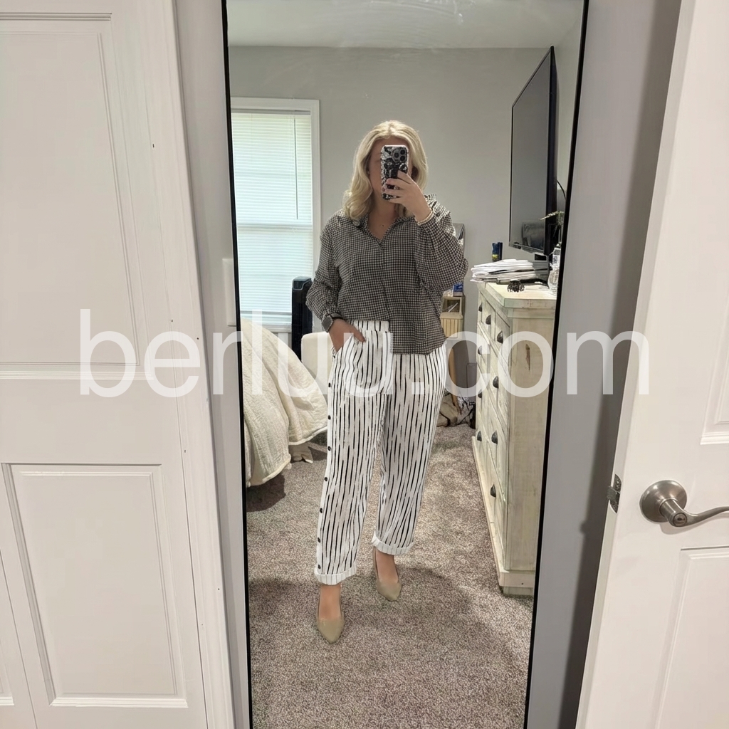 These loose-fit pants feature a modern black abstract stripe print on a white base. Side button details add a unique touch. Elastic waistband and cuffed hems for comfort. Perfect for casual outings or beach days. Effortlessly chic with a relaxed silhouette.